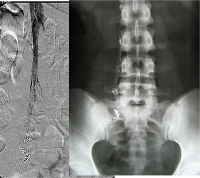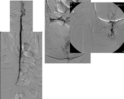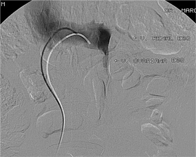 Paciente de 32 anos, feminino, nulípara, procurou consultório com queixa de fadiga nos membros inferiores e varizes vulvares que desciam até a face posterior da coxa direita. Realizado ultrassonografia com Doppler colorido de membros inferiores que mostrou normalidade das veias safenas e do sistema venoso profundo e identificou que as varizes da coxa direita corriam em direção a região genital. Solicitado ultrassonografia endovaginal com Doppler colorido que mostrou varizes pélvicas, sendo de maior calibre junto aos anexos à direita, com diâmetro máximo de 8 mm. A paciente foi submetida a flebografia que mostrou refluxo da veia ovariana direita com progressão do meio de contraste até a vulva. Realizado embolização da veia ovariana direita distalmente com polidocanol 3% para oclusão das colateriais pélvicas e com molas e histoacryl ao longo do seu tronco principal. A flebografia de controle mostrou oclusão completa da veia ovariana direita. Após 30 dias a paciente foi submetida à cirurgia convencional de varizes de membros inferiores através de mine-incisões da pele. Não houve intercorrências relacionadas ao procedimento endovascular e cirúrgico. No seguimento de 10 meses a paciente encontra-se assintomática e sem novas varizes, apresentando telangectasias residuais.